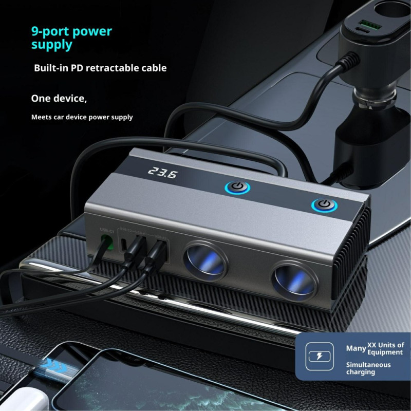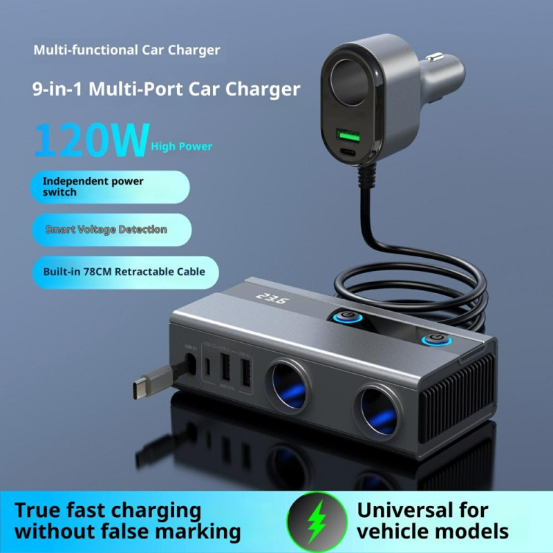9-in-1 120W moniporttinen autolaturi, jossa on 78 cm:n sisäänvedettävä kaapeli ja 65W PD-pikalataus. Kaksoiskytkimet tarkkaa tehonsäätöä varten. Yhteensopiva kaikkien 12V-24V ajoneuvojen kanssa.