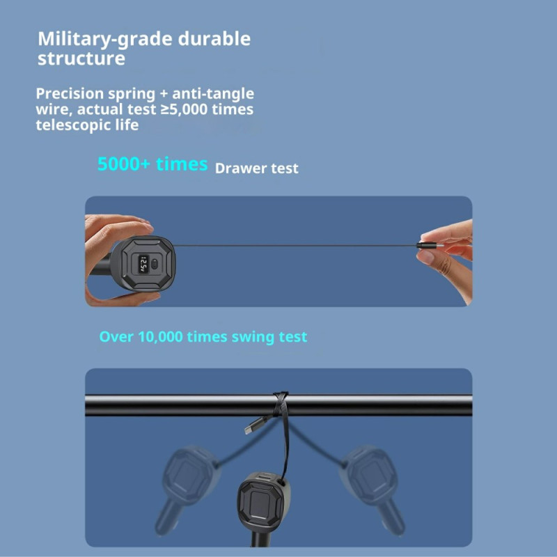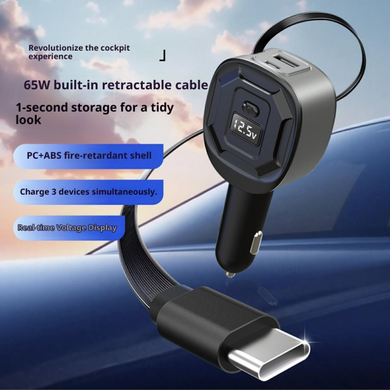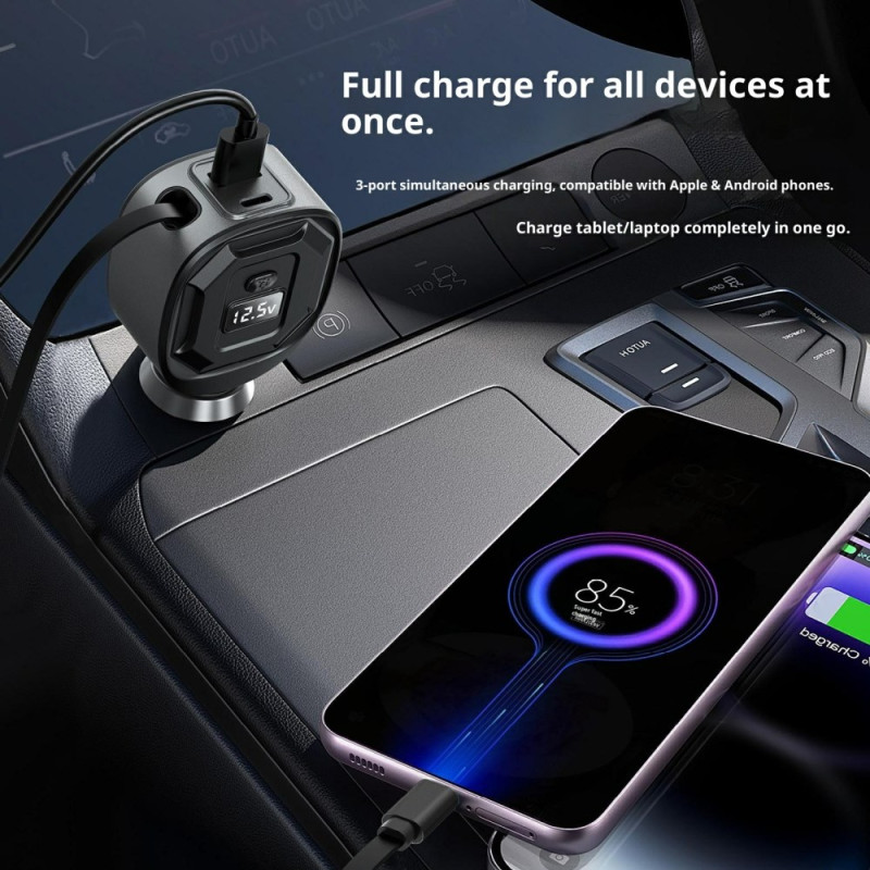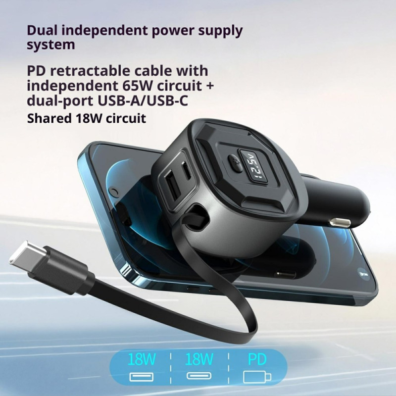Tehokas autolaturi, jossa on kaksi pikalatausporttia (65W PD + 18W USB-A) ja 78 cm:n sisäänvedettävä kaapeli. Reaaliaikainen LED-akun jännitteen näyttö turvallista latausta varten. Yhteensopiva kaikkien 12V-24V ajoneuvojen kanssa.