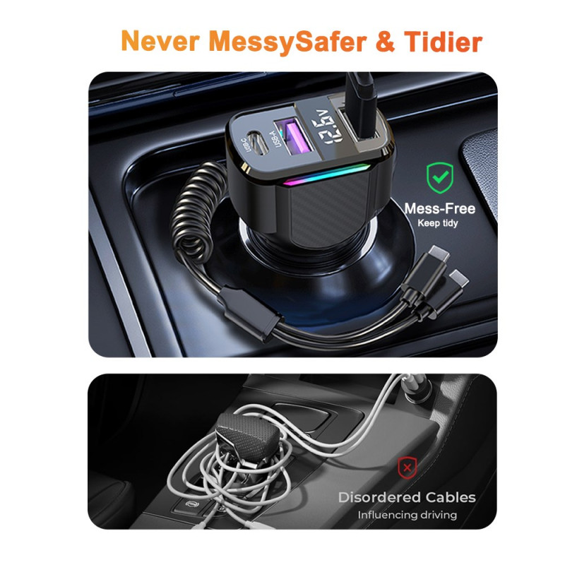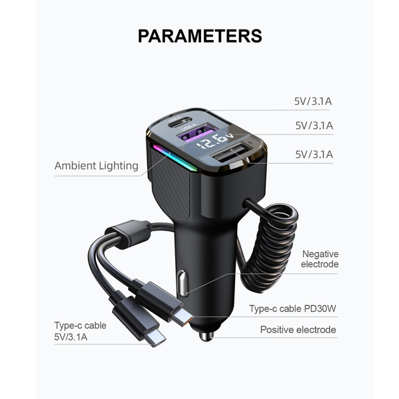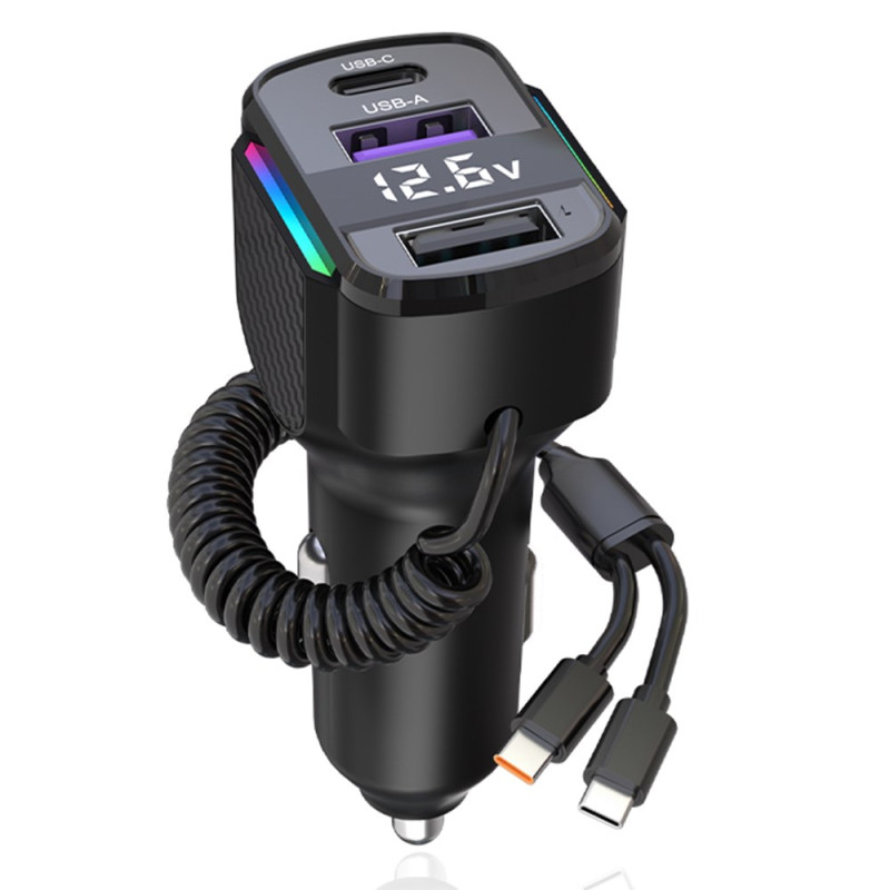 Suorituskykyinen autolaturi, jossa on 30W PD-pikalataus ja 1,2 metrin C-tyypin kierrekaapeli. Värillinen LED-valo helpottaa paikantamista pimeässä. Yhteensopiva kaikkien laitteiden kanssa: iPhone, Samsung, Xiaomi, Huawei ja tabletit.