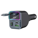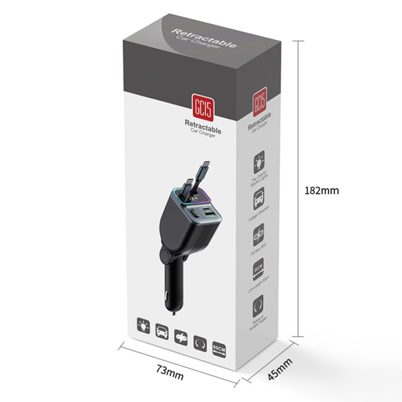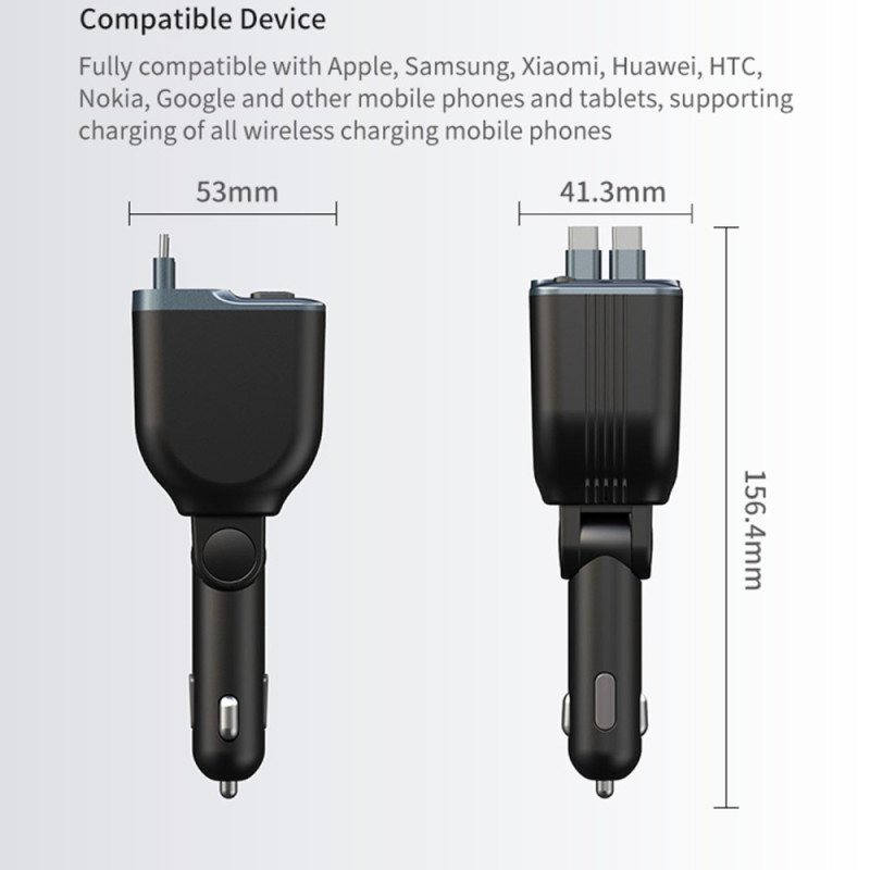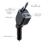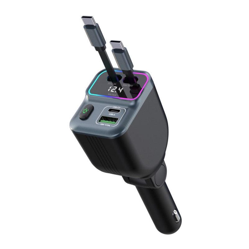 Suorituskykyinen autolaturi, jossa on kaksi sisäänrakennettua sisäänvedettävää USB-C-kaapelia ja reaaliaikainen jännitemittari. 83 W:n yhdistetty teho laitteiden nopeaan samanaikaiseen lataamiseen. Yhteensopiva kaikkien 12V/24V älypuhelinten ja ajoneuvojen kanssa.