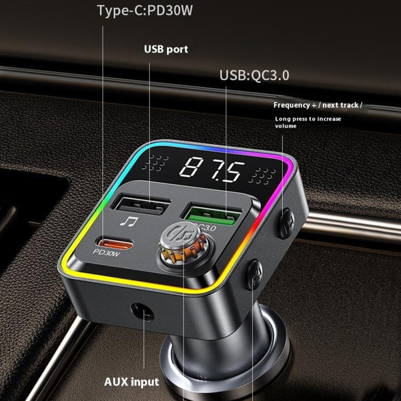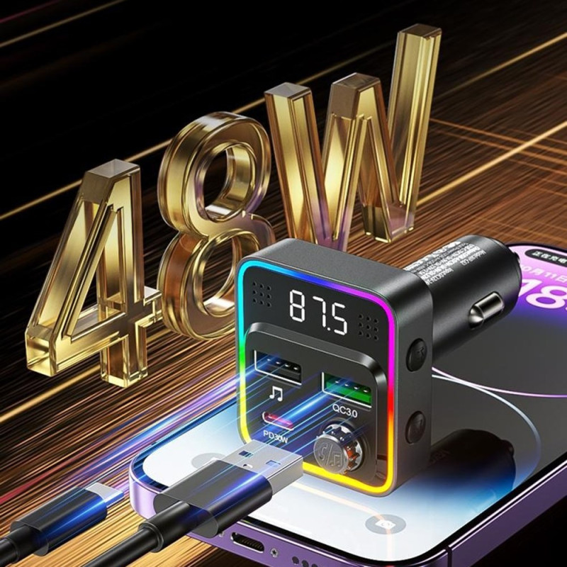 Älykäs 48 W:n autolaturi, jossa on kaksi pikalatausporttia (PD30W + QC3.0), integroitu MP3-soitin ja 7-värinen valaistus. Nauti handsfree Bluetooth-puheluista ja optimaalisesta latauksesta kaikille laitteillesi. 12V-24V yhteensopiva.