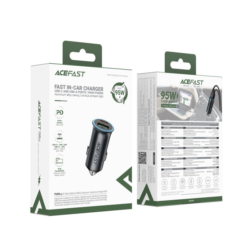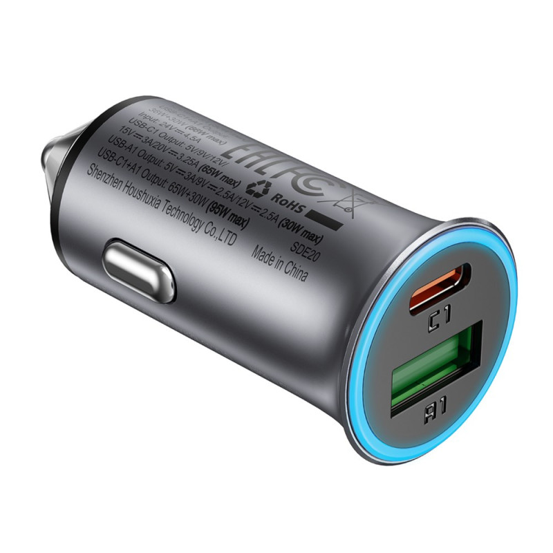 Erittäin tehokas kaksiporttinen autolaturi, joka tarjoaa jopa 95 W yhdistetyn tehon. Nauti nopeasta samanaikaisesta latauksesta USB-C:n (65 W) ja USB-A:n (30 W) kautta. Kompakti, tyylikäs muotoilu, jossa on jäänsininen valorengas tunnelman tuojana.