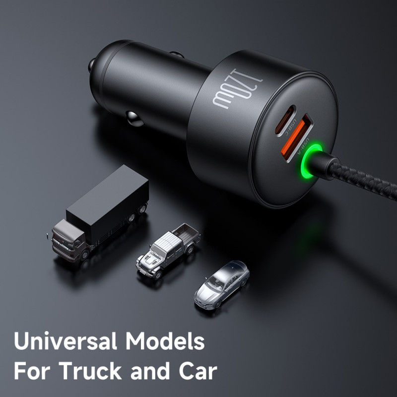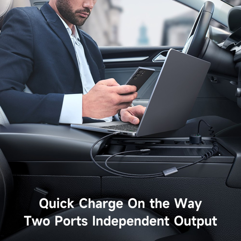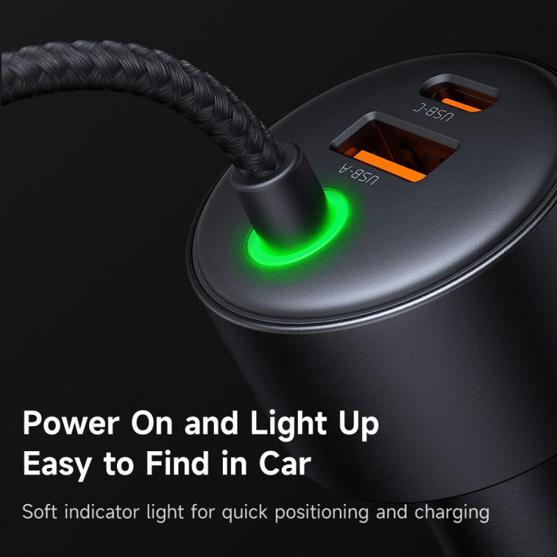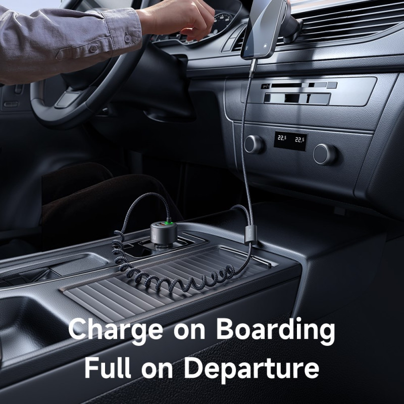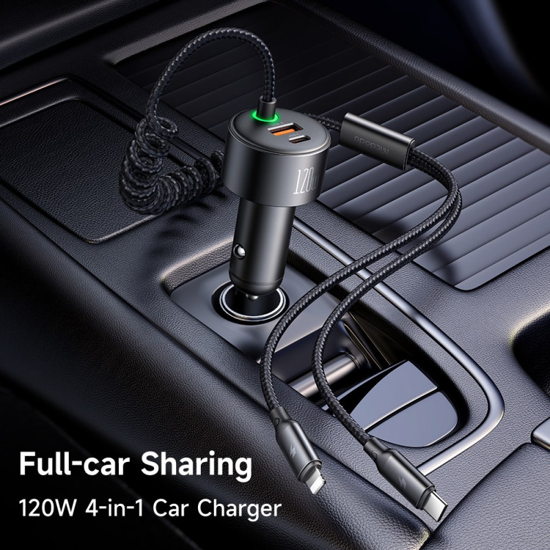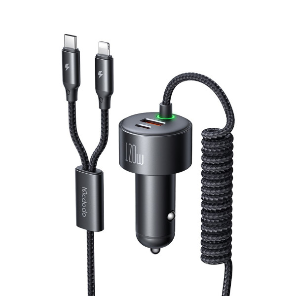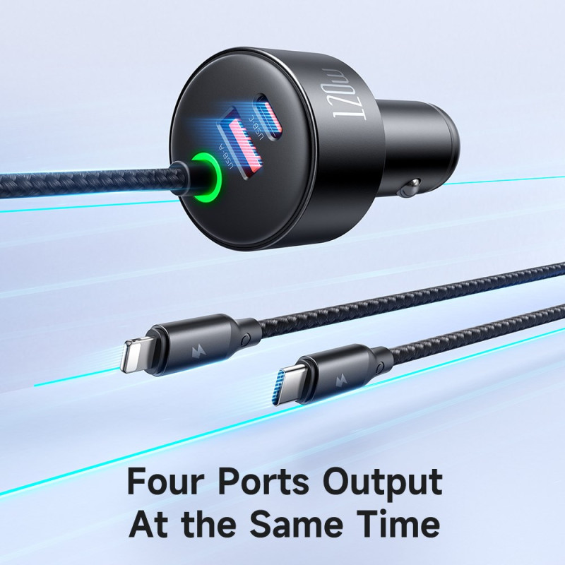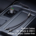 Lataa kaikki laitteesi samanaikaisesti tällä tehokkaalla 120 W:n autolaturilla. USB-C- ja USB-A-portit tarjoavat 60 W ja 30 W, ja siinä on sisäänvedettävät USB-C- ja Lightning-kaapelit, jotka mahdollistavat käytön ilman sotkua.