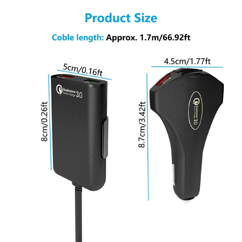 Tehokas autolaturi Qualcomm Quick Charge 3.0 -tekniikalla ja 4 USB-portilla. Lataa jopa 4 laitetta samanaikaisesti nelinkertaisella nopeudella tavallisiin latureihin verrattuna. Erittäin pitkä 1,7 metrin kaapeli mukana, jotta takaistuimella istuvat matkustajat pääsevät helposti käsiksi.