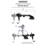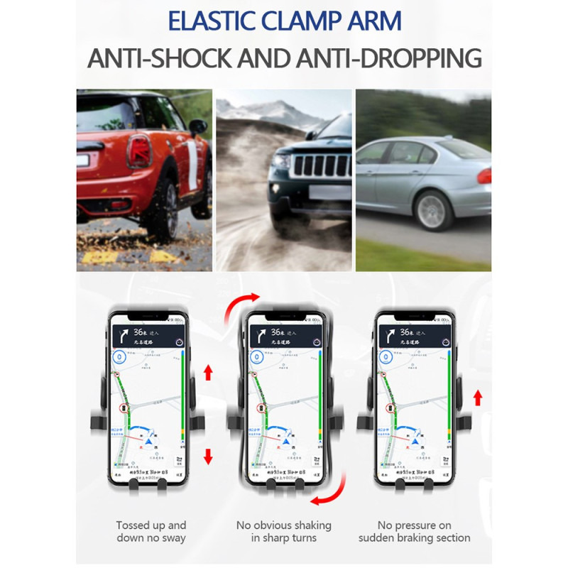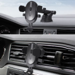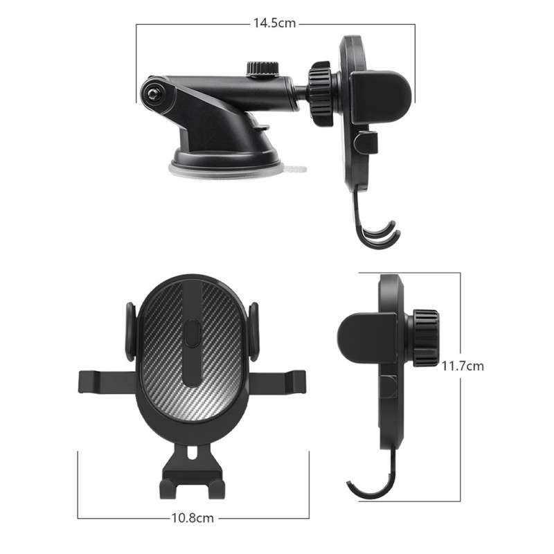 Yleispätevä autopuhelimen pidike, jossa on automaattinen painovoimainen lukitusjärjestelmä. Imukuppikiinnitys tuulilasiin tai kojelautaan. Vakaa kolmiomainen rakenne, 360° kierto, säädettävä teleskooppivarsi. Yhteensopiva älypuhelimien kanssa 64mm - 91mm.