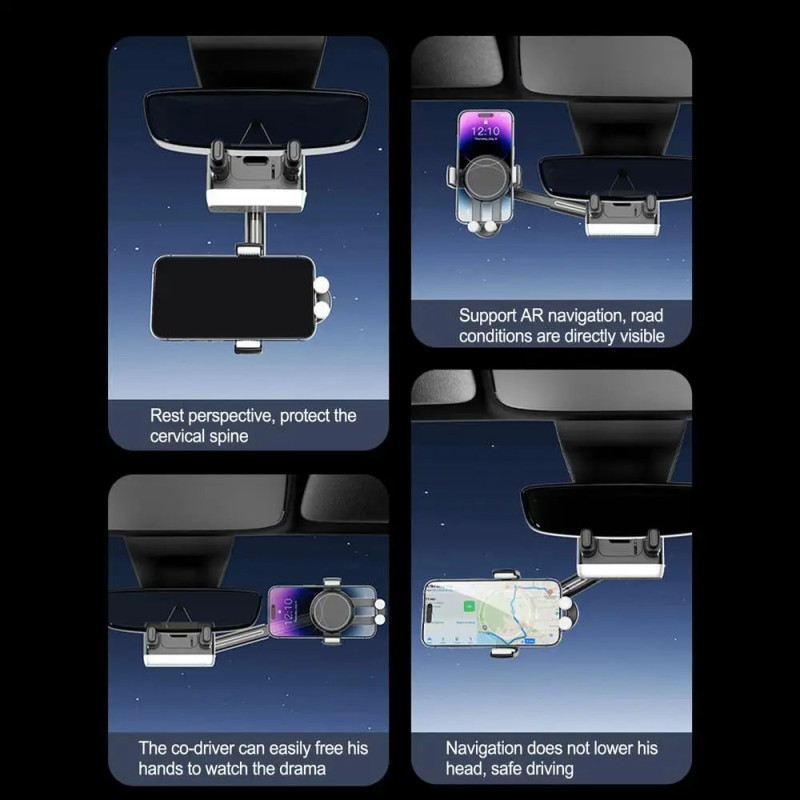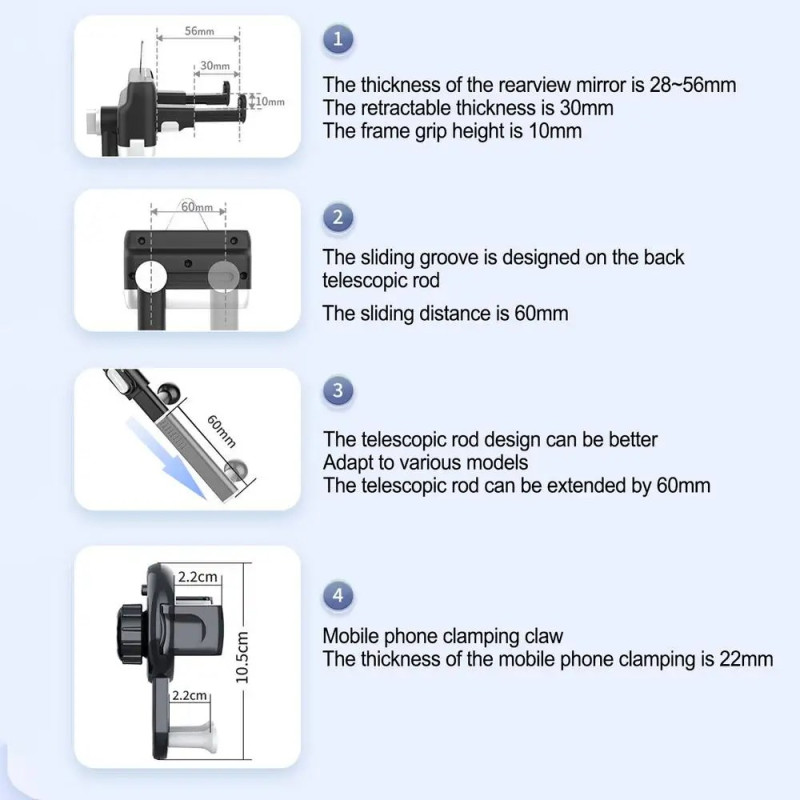 H256-taustapeilipuhelimen kiinnike tarjoaa käytännöllisen ja turvallisen ratkaisun älypuhelimen pitämiseen käden ulottuvilla ajon aikana. Sen säädettävän teleskooppivarren ja 360°:n kääntyvyyden ansiosta voit asettaa täydellisen kulman navigointia varten ilman, että näkökenttä estyy. Se on suunniteltu heijastamattomalla kiinnikkeellä ja silikonipinnoitteella, joka suojaa peiliä ja tarjoaa samalla tukevan ja vakaan otteen. Kevyt ja teräsvaijerinsa ansiosta helppo asentaa, se sopii useimpiin taustapeileihin ja pitää puhelimesi tukevasti paikallaan sujuvampaa ja turvallisempaa ajamista varten.