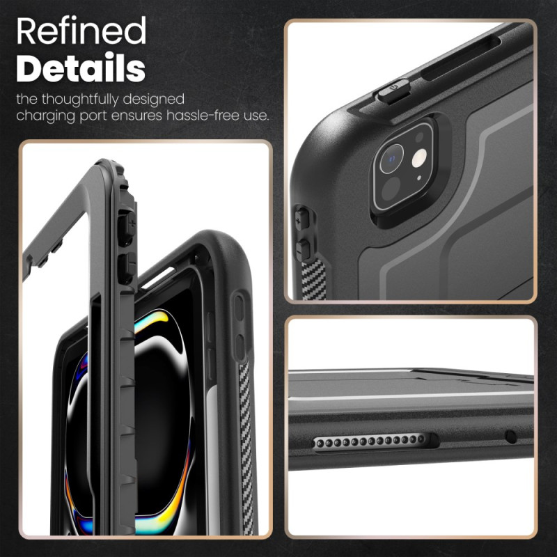 Suojaa iPad Pro 11 (2025) / 11 (2024) -puhelimesi kestävällä ja monipuolisella kotelollamme. Kestävistä materiaaleista valmistettu suojakotelo tarjoaa erinomaisen naarmuuntumis- ja iskunkestävyyden. Integroitu jalusta tarjoaa mukavan handsfree-katselun, kun taas kynäsäilytys ja tarkat leikkaukset takaavat käytännöllisyyden ja täyden toiminnallisuuden.