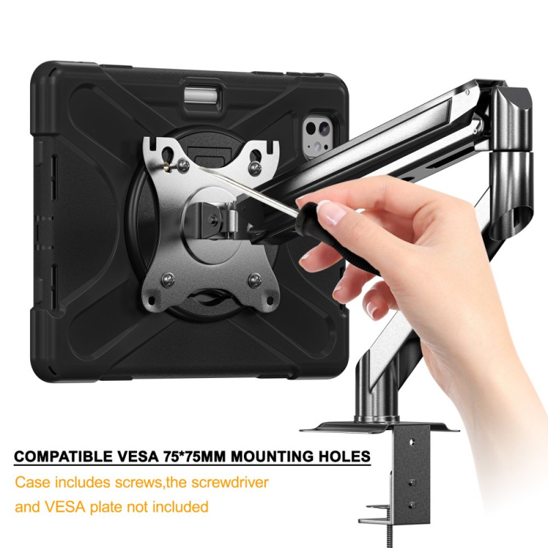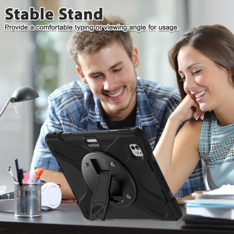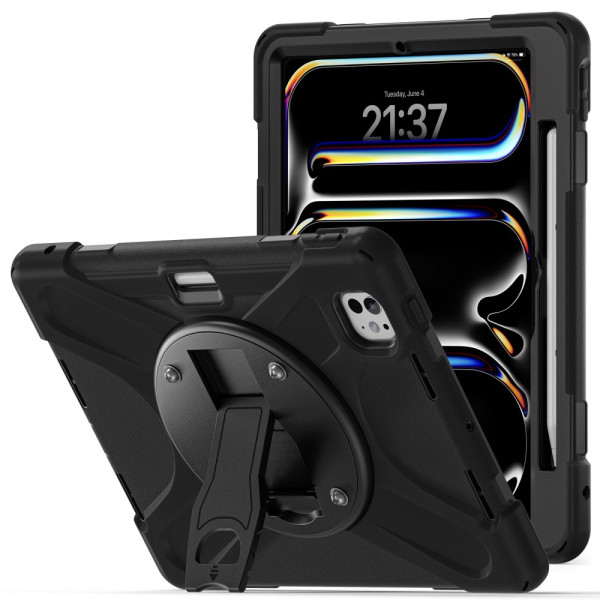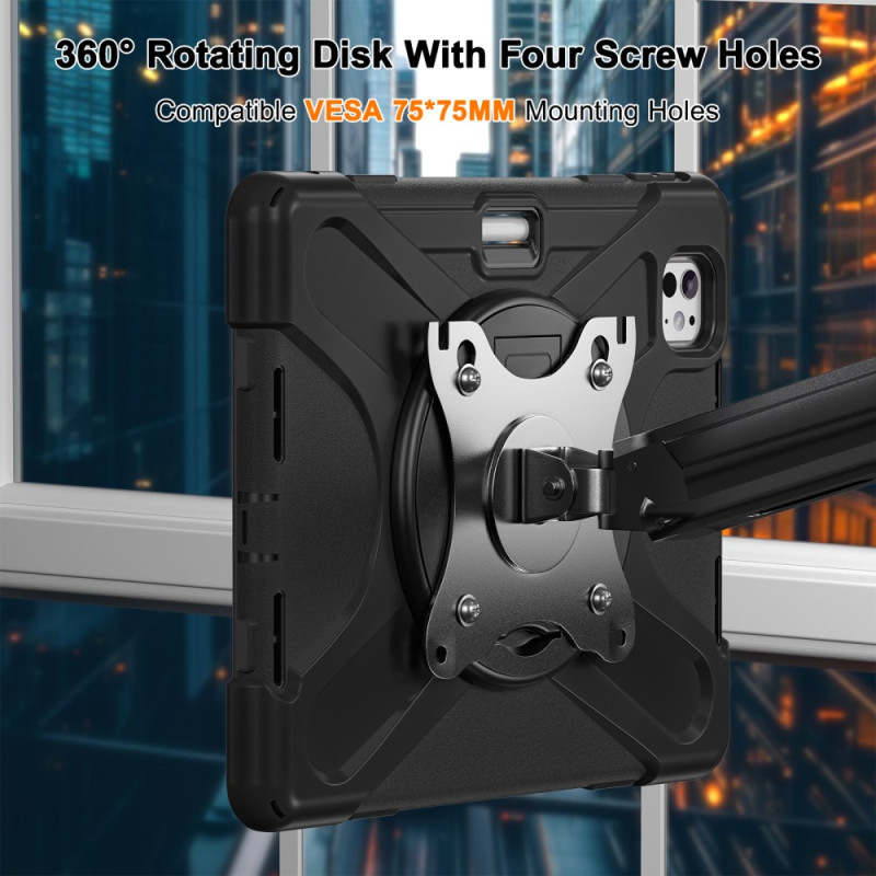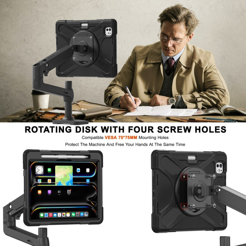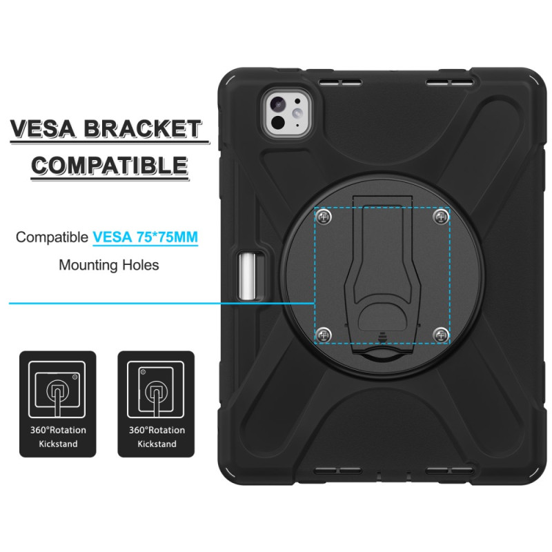 Découvrez notre étui robuste pour iPad Pro 11 (2025) / 11 (2024) avec support rotatif à 360°. Offrant une protection complète contre les chocs et les rayures, il dispose d'un support intégré pour une visualisation mains libres. Compatible VESA et doté d'un emplacement pour stylet, cet étui allie fonctionnalité et durabilité pour une utilisation optimale de votre tablette.