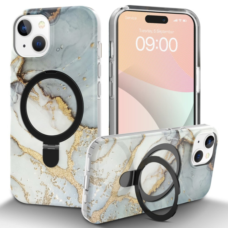 Tutustu tyylikkääseen magneettikoteloon iPhone 15:lle. Se on valmistettu PC:stä ja TPU:sta, ja siinä yhdistyvät kestävyys ja joustavuus. Käytännöllisellä rengaspidikkeellä varustettu suojakuori tarjoaa mukavan otteen ja tukitoiminnon. Tämä MagSafe-latauksen kanssa yhteensopiva suojakuori suojaa laitettasi putoamisilta ja naarmuilta.