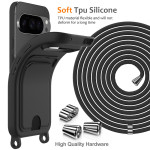 Tutustu nestemäiseen silikonikoteloon Google Pixel 10 Pro XL:lle. Kotelossa on integroitu korttipidike ja säädettävä kantolenkki