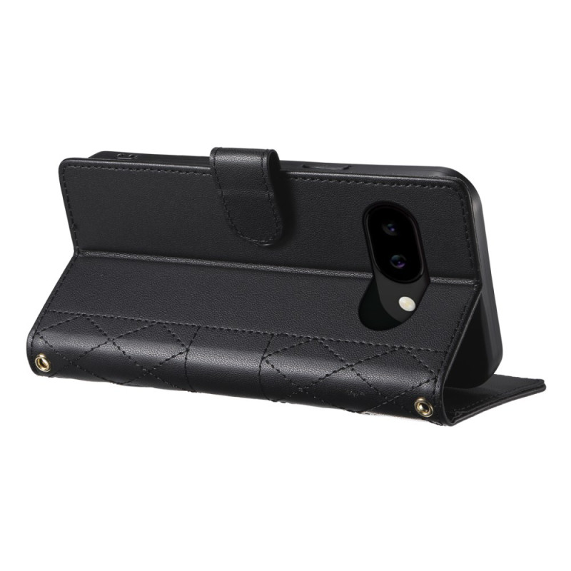 Tyylikäs lompakkokotelo PU-nahkaa timantti kuvio Google Pixel 10A. Sisältää 3 korttipaikkaa, 1 käteistaskun, integroidun jalusta-toiminnon ja magneettisulkimen. Mukana säädettävä irrotettava olkahihna (70-150cm) ja käsihihna kätevää kuljettamista varten.
