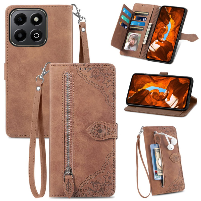Tyylikäs lompakkokotelo PU-nahasta, jossa on hienostunut kukka-aihe. Sisältää useita korttipaikkoja, ulkoisen vetoketjutaskun, handsfree-pidikkeen ja turvallisen magneettisulkimen. Käytännöllisen käsinauhan ansiosta sitä on helppo kantaa.