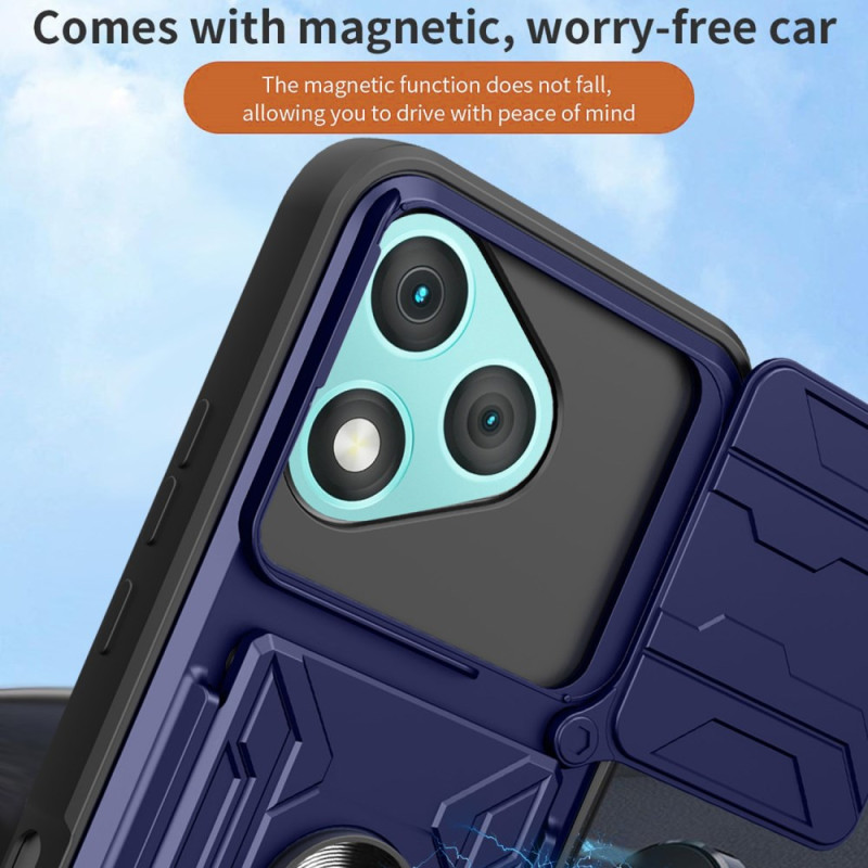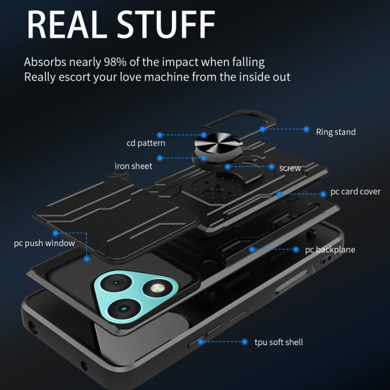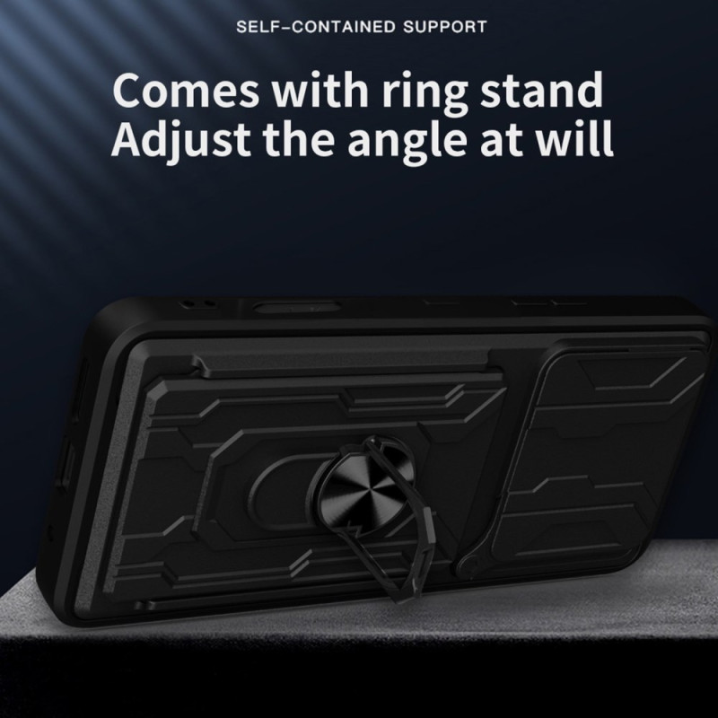 Tukeva suojakuori Honor 400 Lite 5G:lle, jossa on sisäänvedettävä metallinen potkukiinnike, liukuva kamerasuoja ja integroitu korttipidike. Magneettinen autokiinnike yhteensopiva. Vahvistettu suoja kolhuilta ja putoamisilta.