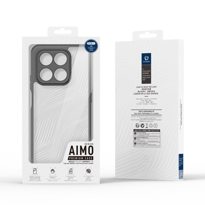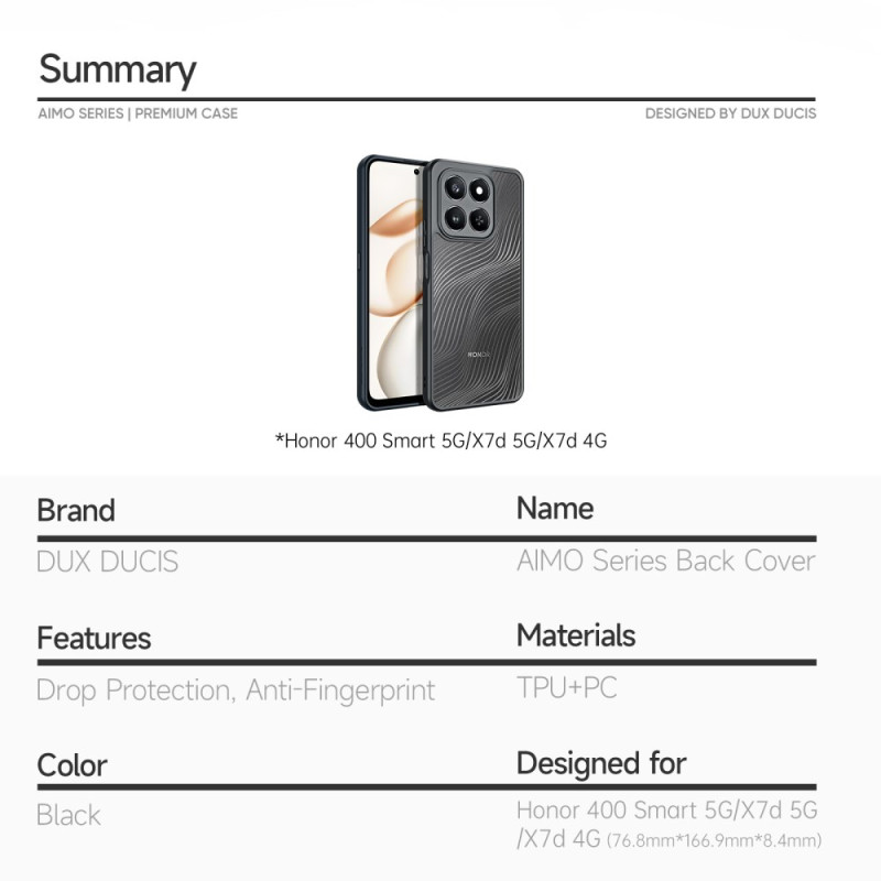 Tutustu DUX DUCIS Aimo -sarjan koteloon Honor 400 Smart 5G / 4G:lle, jossa yhdistyvät tyyli ja suojaus. PC:stä ja TPU:sta valmistettu suojakotelo tarjoaa mukavan otteen, esteettiset linjat ja luotettavan linssisuojan. Se on yhteensopiva näytönsuojien kanssa ja tarjoaa optimaalisen suojan putoamisia ja kolhuja vastaan.