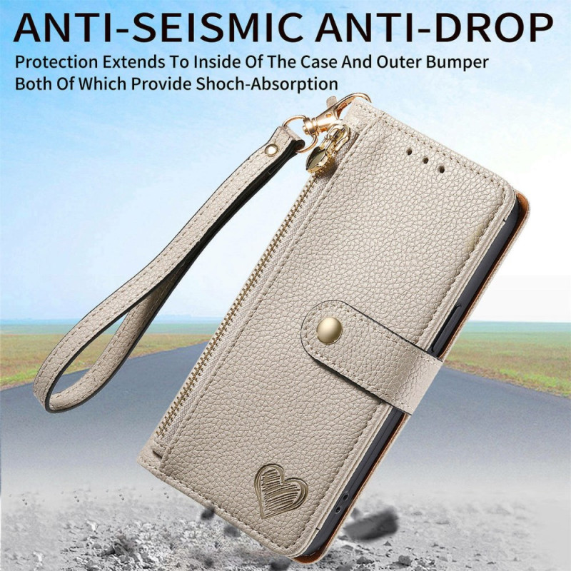 Suojaa älypuhelimesi tyylikkäästi tällä monikäyttöisellä lompakkokotelolla. Anti-RFID-tekniikalla varustettu lompakko suojaa pankkikorttisi ja tarjoaa samalla käytännöllistä säilytystilaa vetoketjullisen taskun ja integroitujen lokeroiden avulla. Sen handsfree-pidike ja irrotettava käsihihna tekevät siitä mukavan ja käytännöllisen jokapäiväiseen käyttöön.