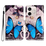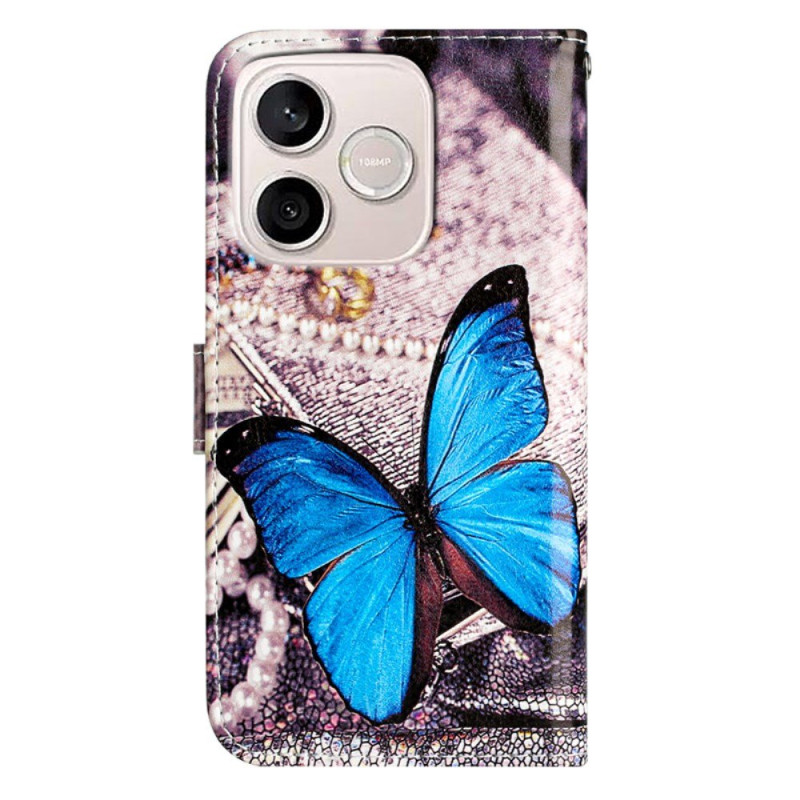 Mukana tyylikäs sininen perhonen, korttipaikat, integroitu jalusta ja rannehihna.