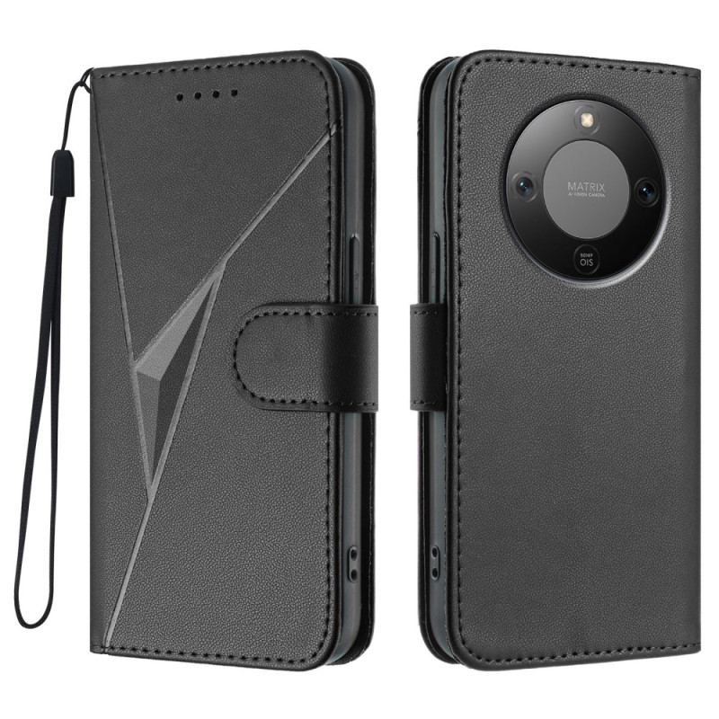 Tyylikäs lompakkokotelo, jossa on hienostunut kolmioaihe, turvallinen magneettisuljenta ja käytännöllinen käsihihna. Valmistettu ensiluokkaisesta PU-nahasta ja pehmeästä TPU:sta optimaalisen suojan takaamiseksi. Säilyttää jopa kolme korttia ja käteistä.