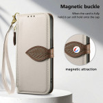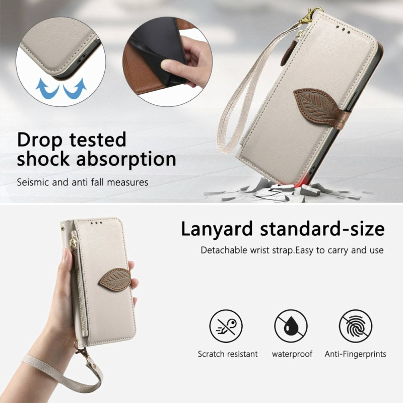 Tyylikäs lompakkokotelo, jossa on lehden muotoinen magneettilukko. Sisältää 3 korttipaikkaa, 1 setelitasku ja ulkoinen vetoketjutasku. Integroitu pidike handsfree-katselua varten ja irrotettava käsihihna helppoa kantamista varten.