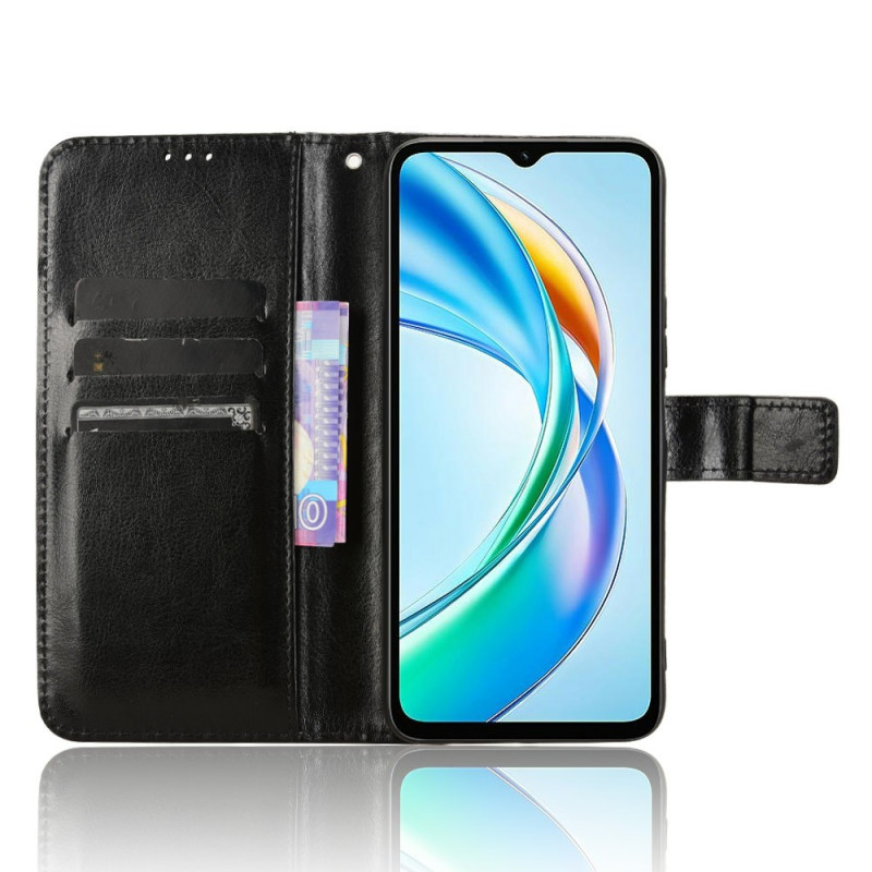 Étui portefeuille élégant en cuir PU avec texture sophistiquée pour Honor X5b Plus / X5b. Doté de 3 emplacements pour cartes, d'un compartiment pour espèces et d'une fonction support mains libres. Fermeture magnétique sécurisée et dragonne incluse pour un transport facile.