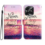Tyylikäs lompakkokotelo, jossa on inspiroiva "Never Stop Dreaming" -aihe. Läppämuotoilu, jossa on monikulmainen tuki, turvallinen magneettisuljenta, 3 korttipaikkaa ja irrotettava käsihihna. Täydellinen suoja ja hienostunut tyyli Honor X5c Plus -puhelimellesi.