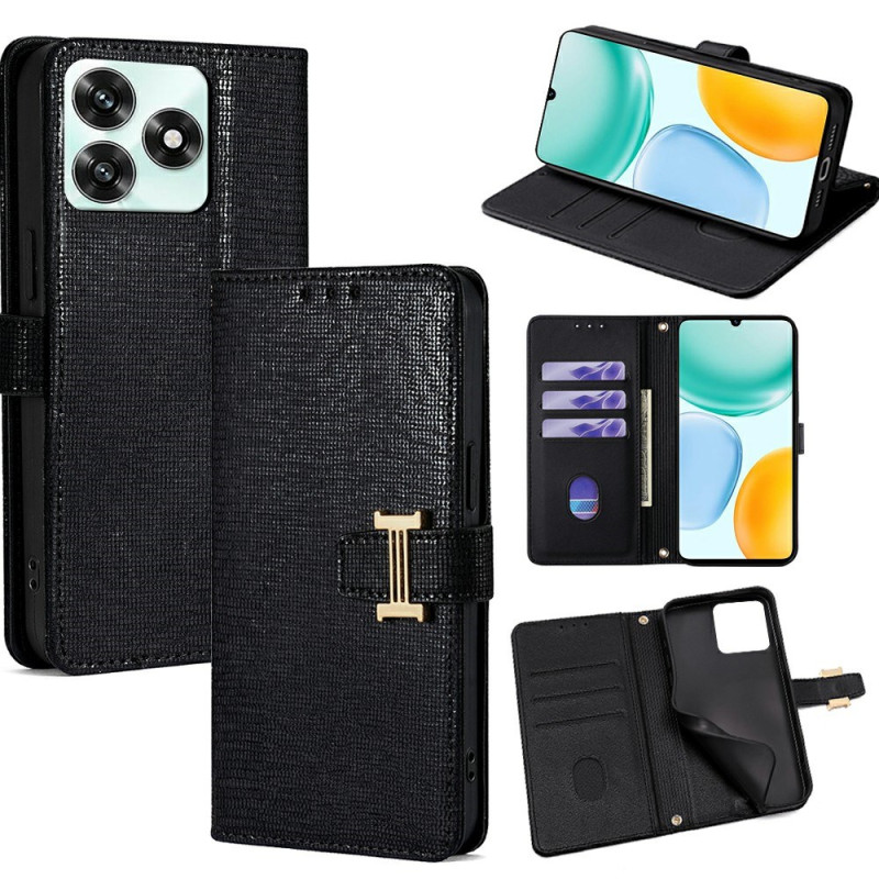 Étui portefeuille élégant pour Honor X5c 4G avec boucle en métal signature et texture raffinée. Comprend 3 emplacements pour cartes, 1 poche pour espèces et support ajustable intégré. Protection double couche contre les rayures et les chutes.