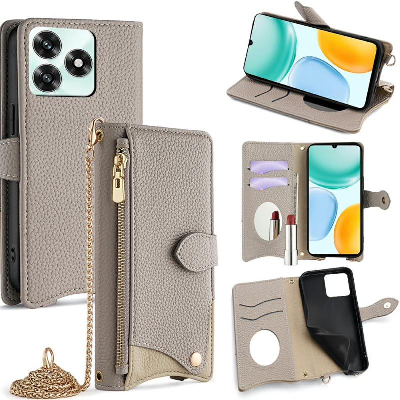 Protégez votre Honor X5c 4G avec style grâce à cet étui portefeuille multifonctionnel. Doté d'un design queue de poisson irrégulier élégant, il combine protection optimale et praticité avec ses emplacements pour cartes, son miroir intégré et sa bandoulière chaîne.