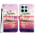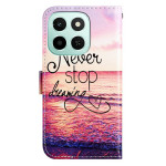 Tyylikäs lompakkokotelo, jossa on inspiroiva "Never Stop Dreaming" -aihe. Yhdistää täyden suojan, lompakkotoiminnallisuuden, 3 korttipaikkaa, säädettävän monihihnatuen ja turvallisen magneettisulkimen. Mukana irrotettava käsihihna....