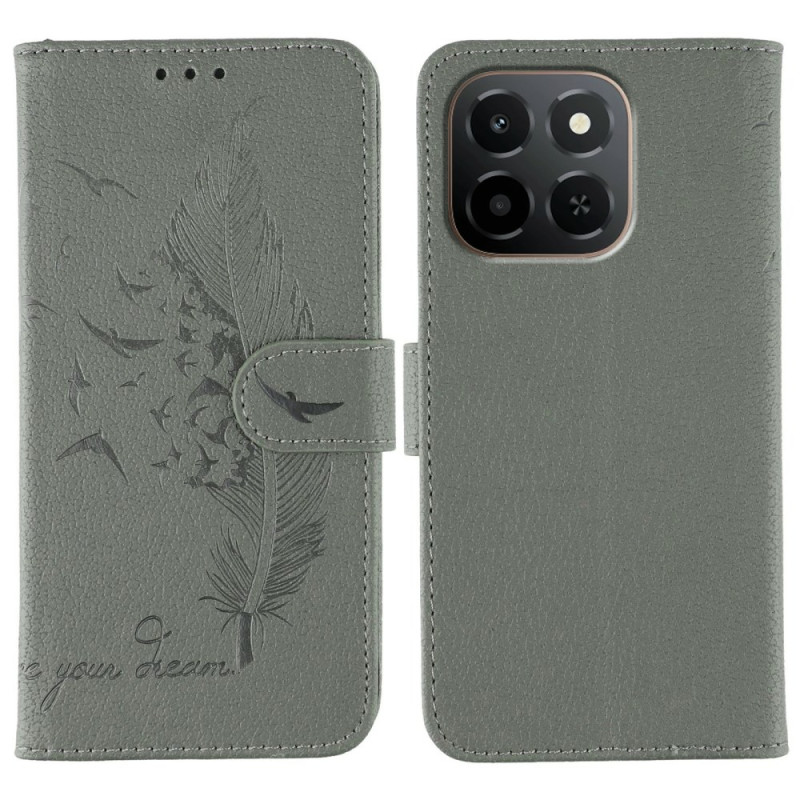 Suojaa Honor X6c 4G -puhelimesi tyylikkäästi tällä kuvioidulla PU-nahasta valmistetulla lompakkokotelolla. Hienostunut muotoilu höyhenaiheella, säädettävä tuki handsfree-katseluun, 3 korttipaikkaa ja sivulokero.