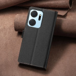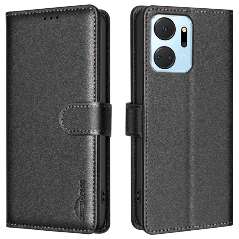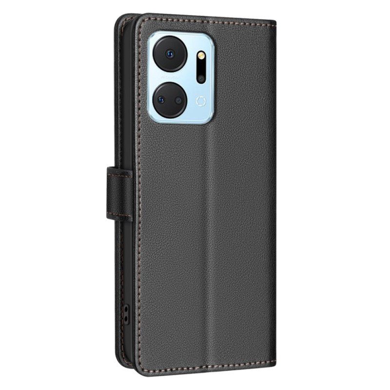 Premium lychee-kuvioitu PU nahkakotelo Honor X7a 4G. 3 korttipaikkaa, 1 hopeinen tasku ja anti-RFID-tekniikka. Turvallinen magneettilukko ja handsfree-tukitoiminto optimaaliseen jokapäiväiseen mukavuuteen.