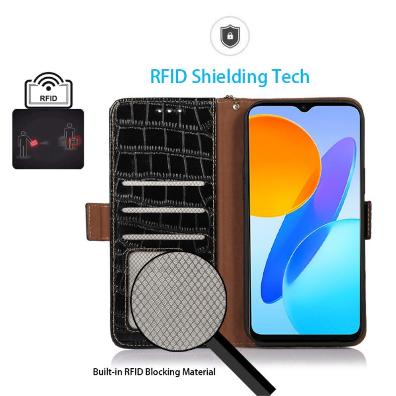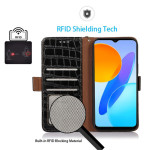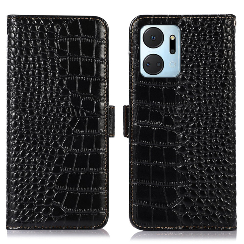 Tyylikäs lompakkokotelo aidosta nahasta, jossa on krokotiilipinta Honor X7a 4G:lle. Sisältää 3 korttipaikkaa, 1 käteistaskun ja RFID-sulkutekniikan. Integroitu säädettävä jalusta mukavaa katselua varten.
