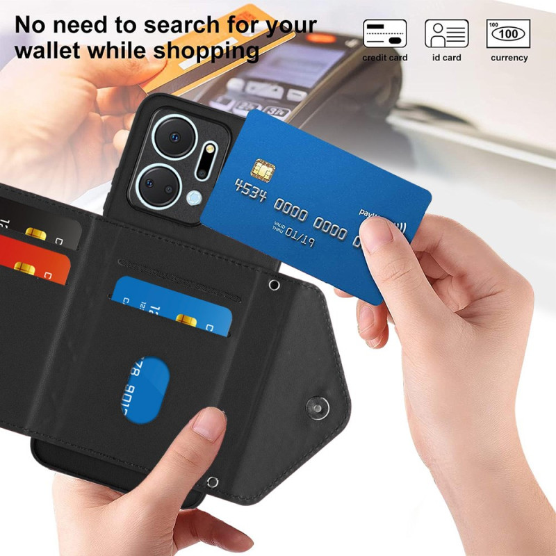 Protégez votre Honor X7a 4G avec élégance grâce à cet étui porte-cartes multifonctionnel. Doté d'une protection RFID avancée, il sécurise vos informations personnelles tout en offrant un support mains libres pratique pour vos vidéos.