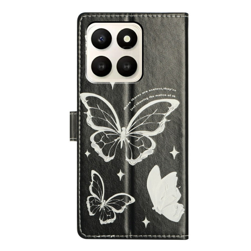 Elegantti läppä lompakko suojakotelo Honor X7d 5G hienostunut perhonen tulostaa. Sisältää 2 korttipaikkaa, 1 valokuvataskun ja käteislokeron. Integroitu jalusta-toiminto handsfree-katseluun. Mukana turvallinen magneettisuljenta ja irrotettava käsihihna.