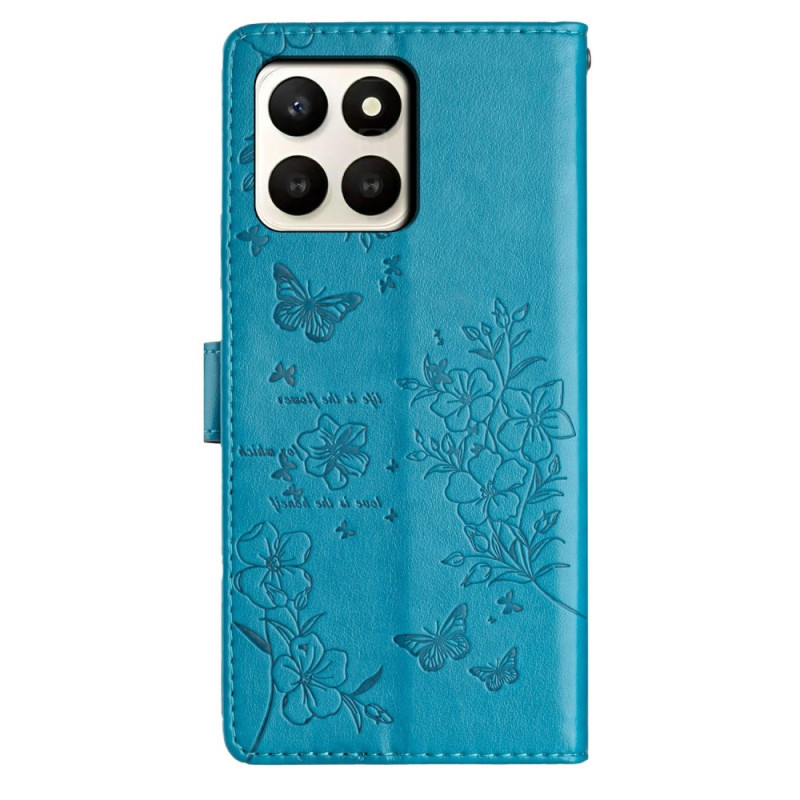 Elegantti lompakko suojakotelo Honor X7d 5G kukka ja perhonen tulostaa. PU-nahasta valmistettu läppämalli, jossa on integroitu jalusta, korttipaikat ja käytännöllinen käsihihna. Täydellinen suoja kolhuilta ja naarmuilta.