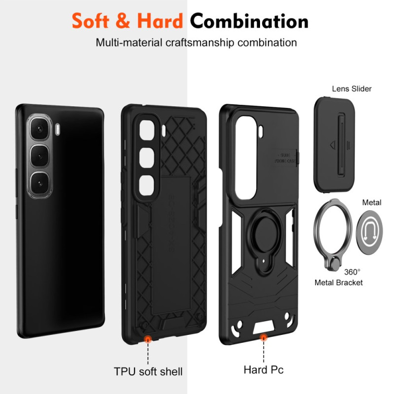 Täydellinen suoja Infinix Hot 60i 4G -puhelimelle, jossa yhdistyvät tyyli ja toiminnallisuus. Sisältää innovatiivisen liukukamerasuojan, integroidun jalustan ja metallirenkaan, joka takaa turvallisen otteen. Yhteensopiva magneettipidikkeiden kanssa.
