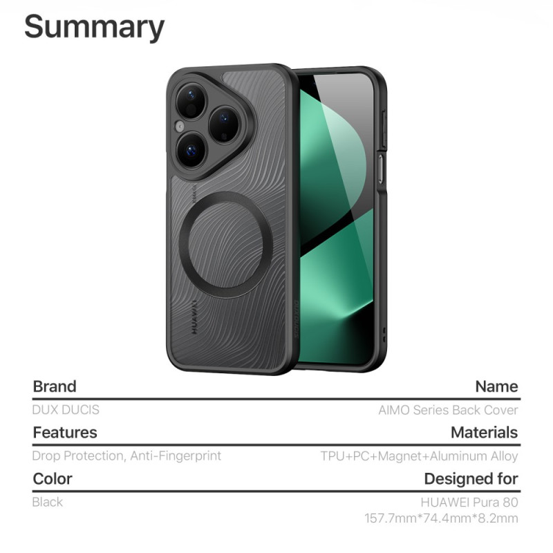 Suojaa Huawei Pura 80 -puhelimesi tyylikkäästi tällä REACH-sertifioidulla DUX DUCIS -kotelolla. Erittäin ohut ja kevyt suojakuori suojaa iskuilta, jotka on testattu jopa 1,2 metrin korkeuteen asti, ja on samalla MagSafe-yhteensopiva optimaalista langatonta latausta varten.
