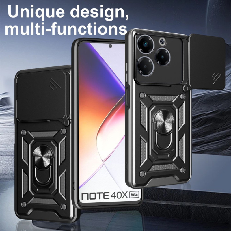 Suojaa Infinix Note 40X 5G -puhelimesi tällä kestävällä suojakuorella , jossa on liukuva kamerasuoja, monikulmainen pyörivä potkulaite ja sotilasluokan iskunkestävyys. Yhteensopiva magneettisen autokiinnikkeen kanssa.