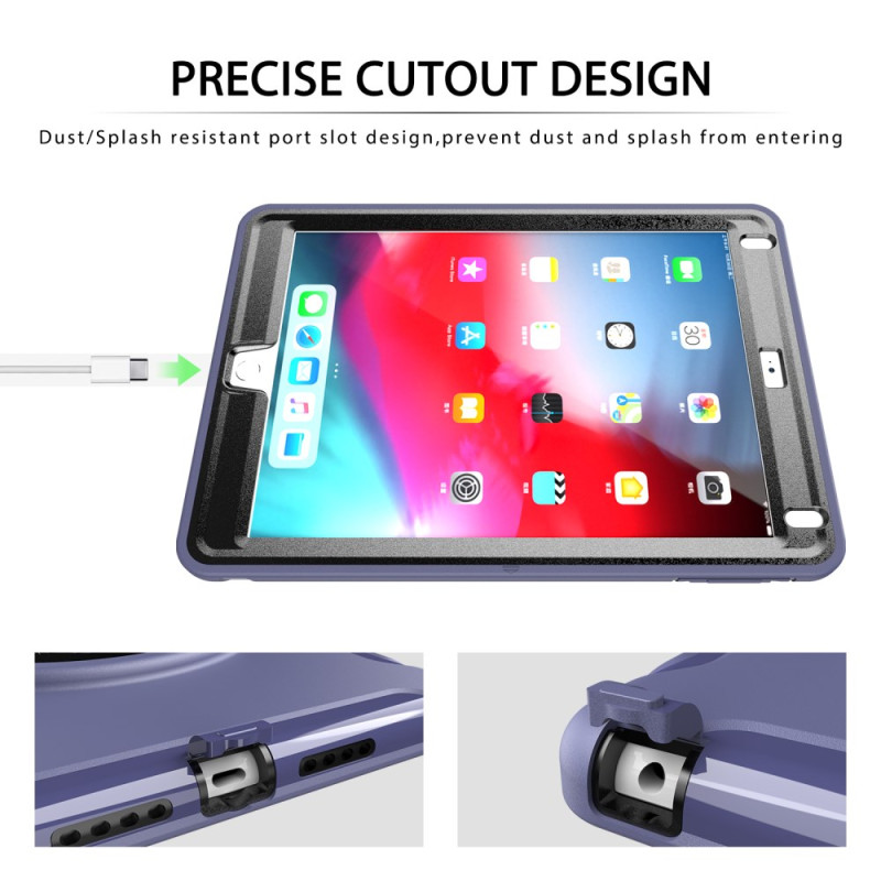 Protection complète pour iPad( 9.7 pouces) / iPad Pro 9.7 pouces / iPad Air / iPad Air 2 avec support pivotant 360°, sangle main ajustable et emplacement stylet. Conception robuste en PC et TPU avec doublure intérieure en mousse pour une protection optimale contre les chocs et les rayures au quotidien.