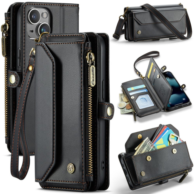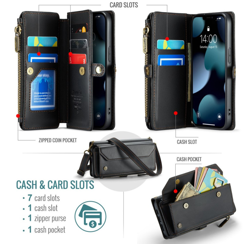 Tutustu CASEME-monitoimikoteloon iPhone 13 minille: RFID-suojaus, 10 korttipaikkaa, vetoketjullinen lompakko ja irrotettava olkahihna. Yhdistä tyyli, turvallisuus ja käytännöllisyys tässä premium-luokan PU-nahkalompakossa.
