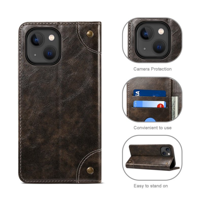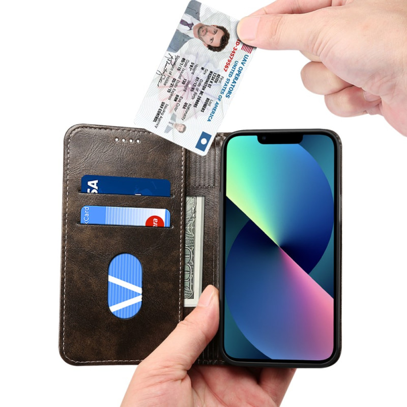 Tyylikäs lompakkokotelo, jossa on automaattinen magneettisuljenta iPhone 13 Minille. Siinä yhdistyvät kaksikerroksinen iskunkestävyys ja käytännölliset toiminnot, ja siinä on korttipaikat, muistiinpanolokero ja se muuntuu katselutelineeksi. Optimaalinen suojaus korotetuilla reunoilla kameraa varten.