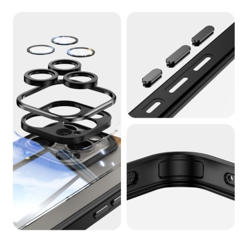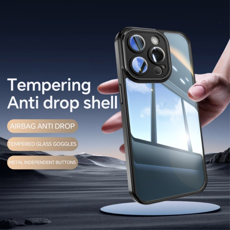 Täydellinen 2-in-1-suojaus iPhone 13 Pro Max -puhelimelle: iskunkestävä läpinäkyvä TPU-suojakuori , jossa on airbag-muotoilu ja teräväpiirtoinen karkaistu lasikalvo. Erilliset metallipainikkeet ja integroitu suojaus valokuvauslinssille maksimaalista turvallisuutta varten.