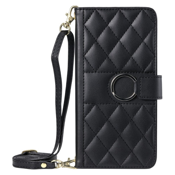 Tyylikäs PU-nahkamainen lompakkokotelo iPhone 13 Pro Maxille hienostuneella timanttikuviolla. Sisältää koristerenkaan, 5 korttipaikkaa, kolikkotaskun ja jalustatoiminnon. Mukana kaksi hihnaa.