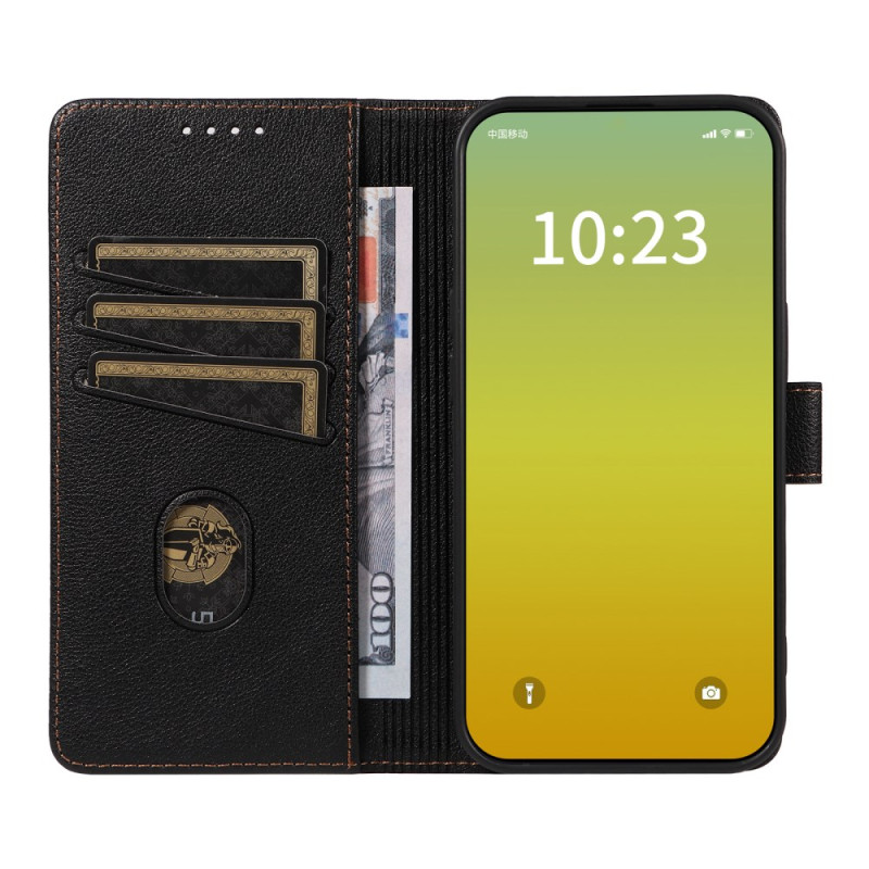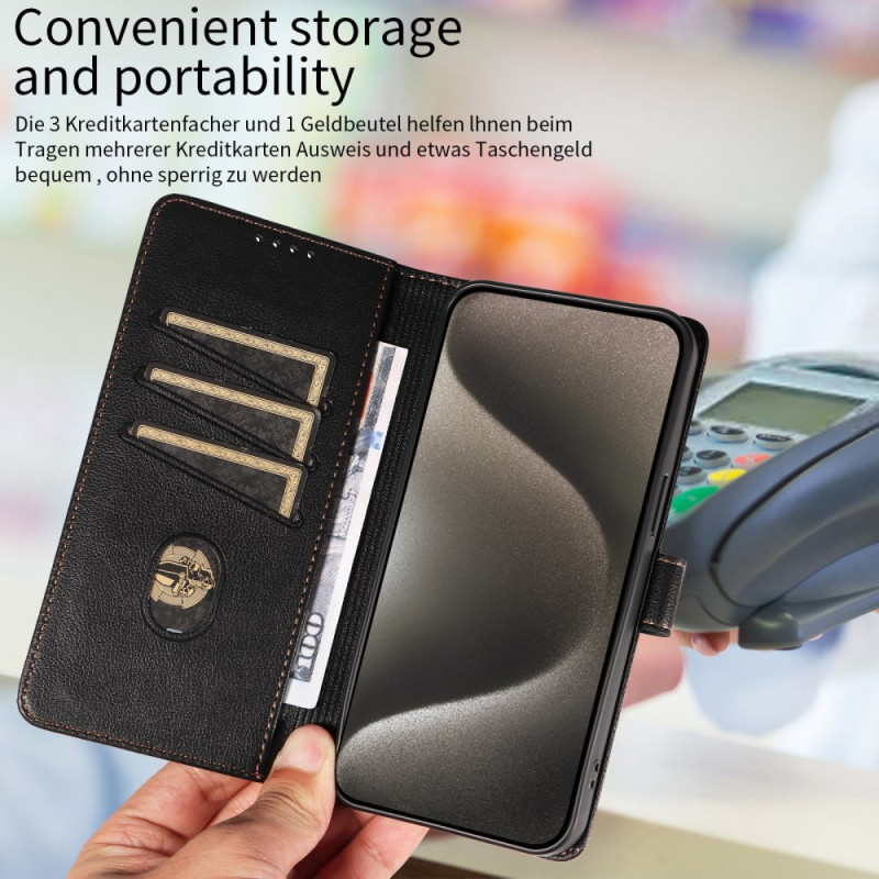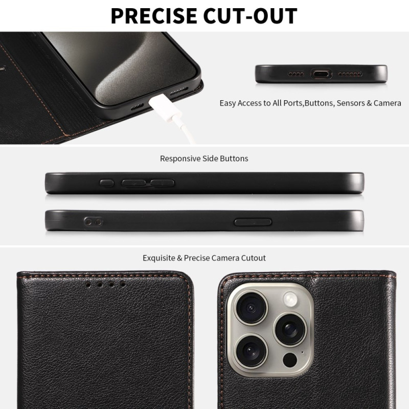 Suojaa iPhone 13 Pro Max -puhelimesi tyylikkäästi tällä lompakkokotelolla, joka on lychee-kuosista PU-nahkaa. Siinä on 3 korttipaikkaa RFID-suojauksella, käteistasku ja handsfree-tuki. Turvallinen magneettisuljenta ja täysi suoja kolhuilta ja naarmuilta.