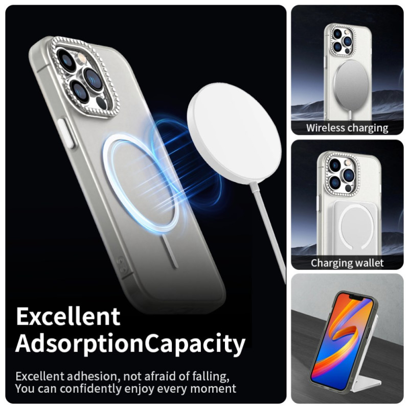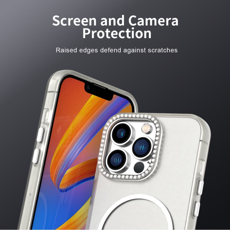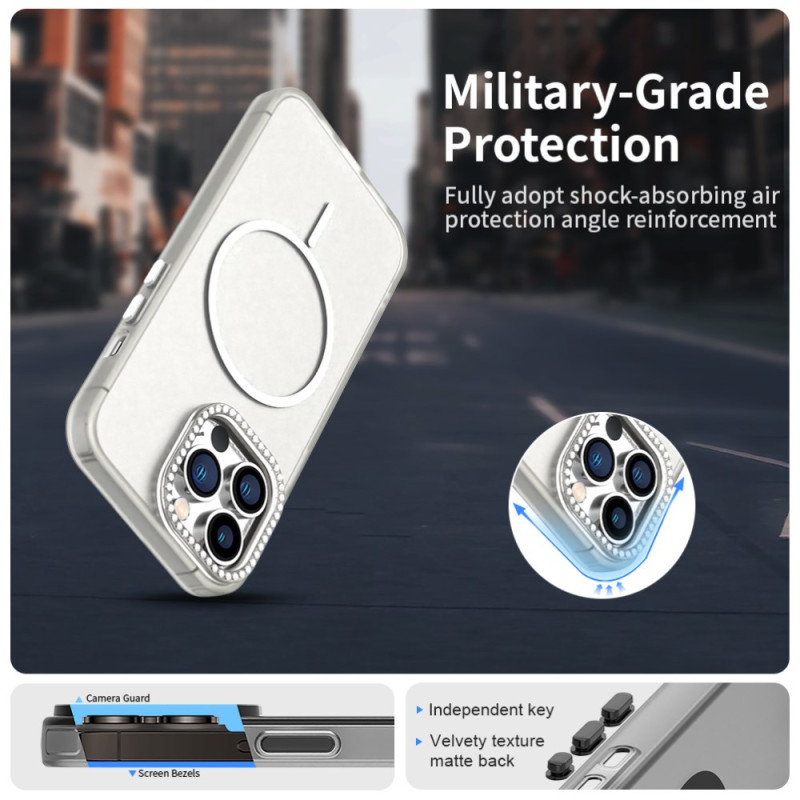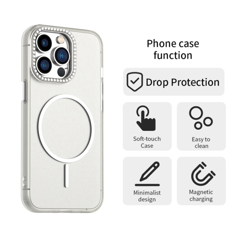 Suojaa iPhone 13 Pro -puhelimesi tyylikkäästi tällä MagSafe-yhteensopivalla kotelolla. Sen ohut ja kestävä muotoilu tarjoaa optimaalisen suojan jokapäiväisiä kolhuja vastaan, ja strassikoristeinen linssikehys tuo ripauksen glamouria.