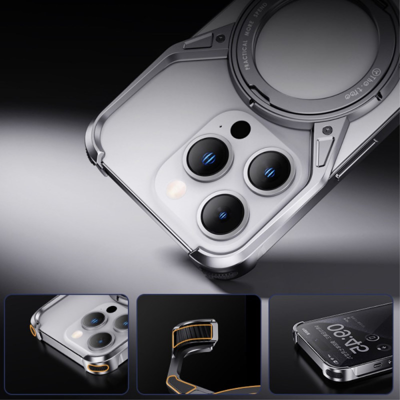 Tutustu ilmailu- ja avaruusteollisuuden alumiiniseoksesta valmistettuun puskurikoteloon iPhonelle. Siinä on 360° kääntyvä kiinnitys, ja se tarjoaa erinomaisen suojan iskuja vaimentavilla silikonikulmilla ja korotetuilla reunoilla. Kevyt ja tyylikäs suojakuori on yhteensopiva magneettikiinnikkeiden kanssa, ja se on kiinnitetty ruuveilla vankan suojan takaamiseksi.