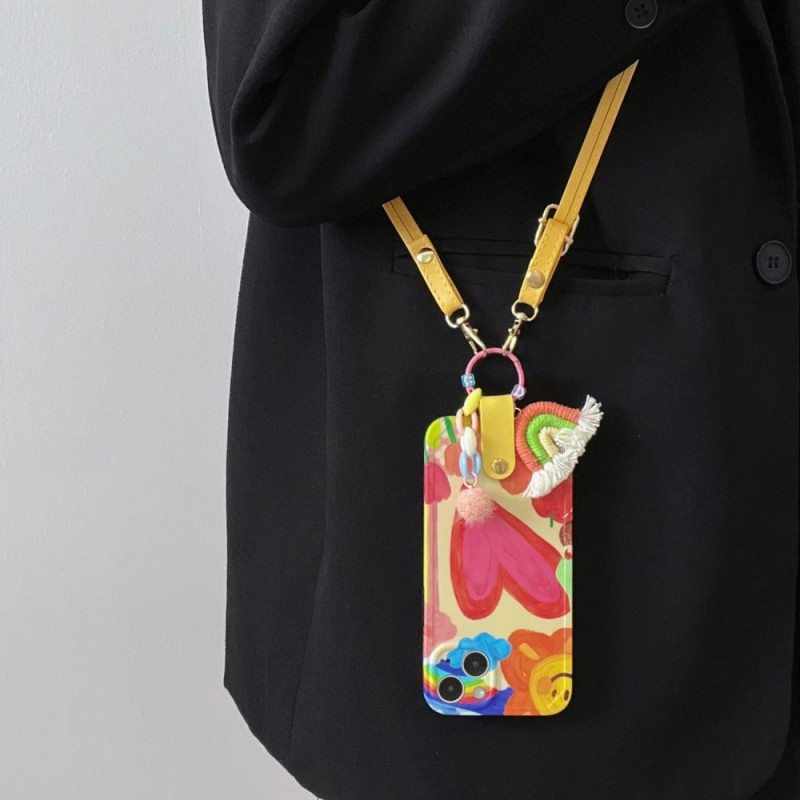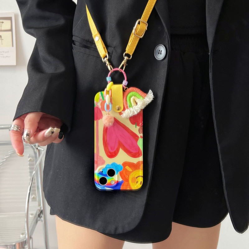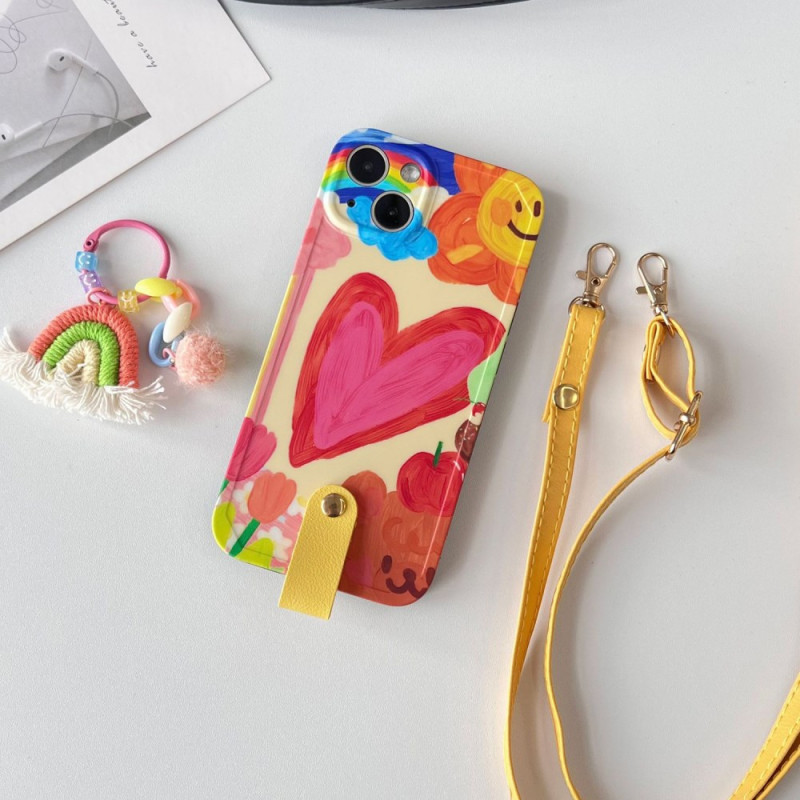 Tutustu tyylikkääseen koteloon iPhone 13:lle, jossa yhdistyvät tyyli ja suojaus. Graffiti-sydänmotiivin ja sateenkaarikoristeen ansiosta se tuo puhelimeesi ripauksen fantasiaa. Säädettävän nahkahihnan ansiosta sitä on helppo kantaa, ja iskunkestävä muotoilu suojaa laitettasi jokapäiväisessä käytössä.