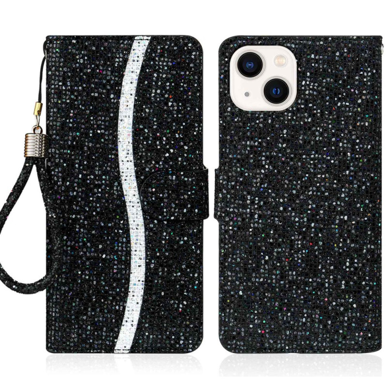 Housse portefeuille en cuir PU scintillant pour iPhone 14 Plus. Protection premium, design élégant, fonction support et fermeture magnétique. Rangements pratiques pour cartes et argent. Dragonne incluse pour transport facile.