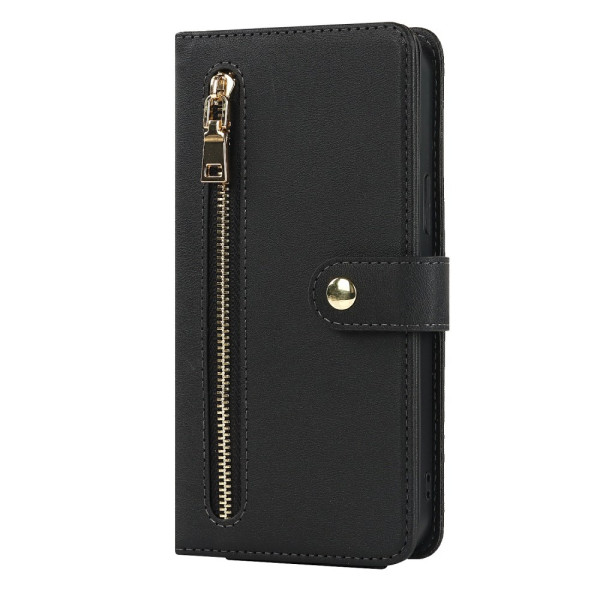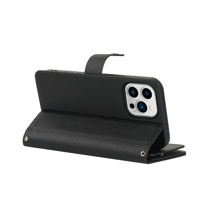 Étui portefeuille multifonction en cuir PU pour iPhone 14 Pro Max. Design tout-en-un avec multiples fentes pour cartes, poche zippée et compartiment pour espèces. Livré avec deux bandoulières détachables (poignet et épaule ajustable). Fonction support intégrée pour visionnage mains libres et fermeture magnétique sécurisée.