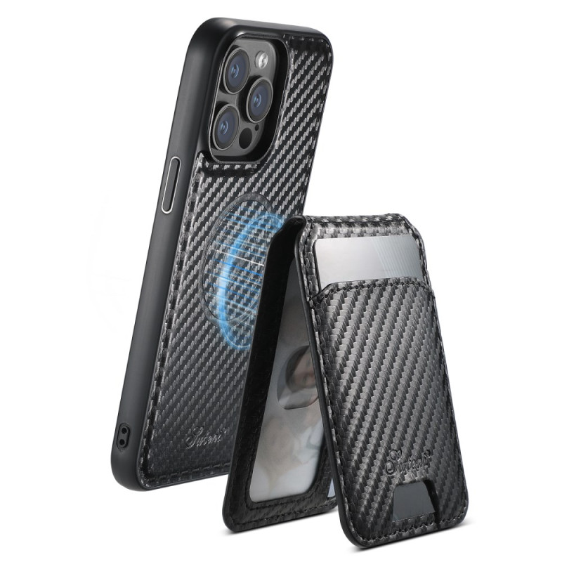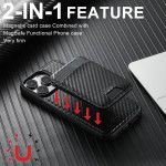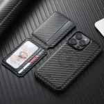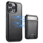 Magneettinen 2-in-1-suojakuori hiilikuitukuvioidusta PU-nahasta ja TPU:sta iPhone 14 Pro Maxille. Irrotettava korttipidike 3-4 korttipaikalla, jalusta-toiminto ja MagSafe-yhteensopivuus. Tyylikäs ja käytännöllinen suoja arkeen.