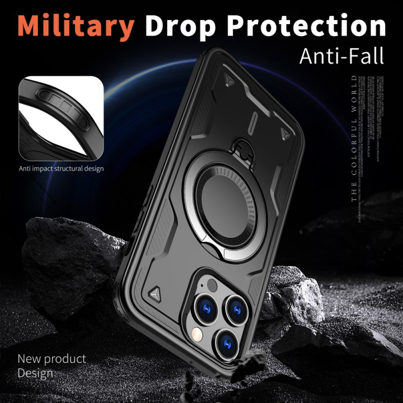 Suojaa iPhone 14 Pro Max -puhelimesi tällä vankalla PC+TPU-sotilaskotelolla, joka on MagSafe-yhteensopiva. Kotelossa on 360° kääntyvä jalusta, joka suojaa täydellisesti iskuilta ja putoamisilta ja tarjoaa samalla täydellisen handsfree-kokemuksen.