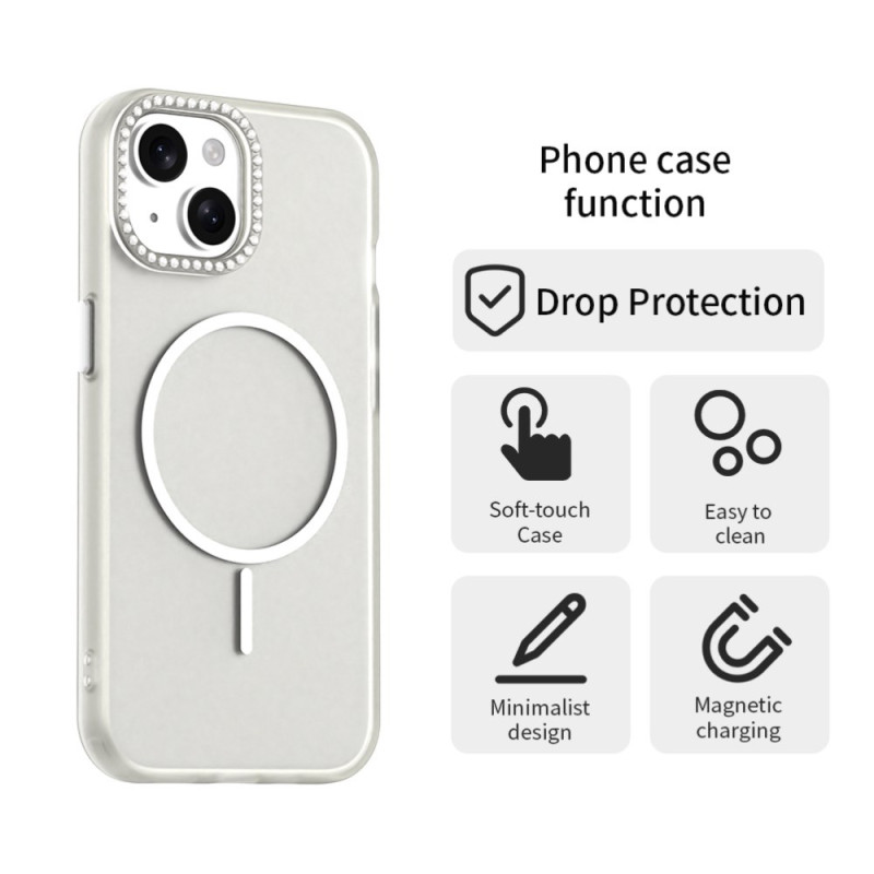 Tutustu tyylikkääseen, suojaavaan koteloon iPhone 15 Plus / 14 Plus -puhelimelle. MagSafe-yhteensopiva suojakotelo suojaa luotettavasti jokapäiväiseltä kulutukselta ja pieniltä pudotuksilta. Sen strassikivinen linssikehys antaa ripauksen glamouria, ja sen tarkka muotoilu takaa täyden pääsyn puhelimesi kaikkiin ominaisuuksiin.